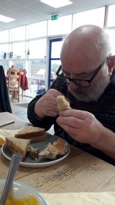 The food came, we learnt that hot pork sandwiches are too chewy. Swallowing for vascular dementia suffers can become problematic, so we do have to be careful to make foods easy, there may come a time when we need to mash everything. Dad does like cheese and onion though, after a swap round of orders everyone was happy.